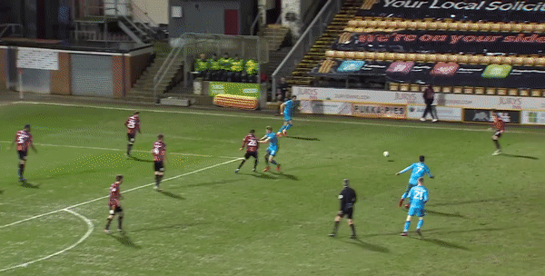 I chose this clip to illustrate a few points. Context: Cheltenham have just lost the ball after a longish spell of build up (they got bogged down). This shows them (and Jake) flooding back to cover the middle. Jake (no 21) doing something Witsel-like in the centre circle shuffling it a few yards wide. Then doing something un-Witsel-like, quickly joining in up the pitch and sending in vertical ball to cause some bother:
