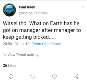 I reckon one of my greatest examples of this is Axel Witsel. Disliked in the Riley household, but gracing the biggest sides in every country he’s played in while amassing over 100 caps for Belgium: